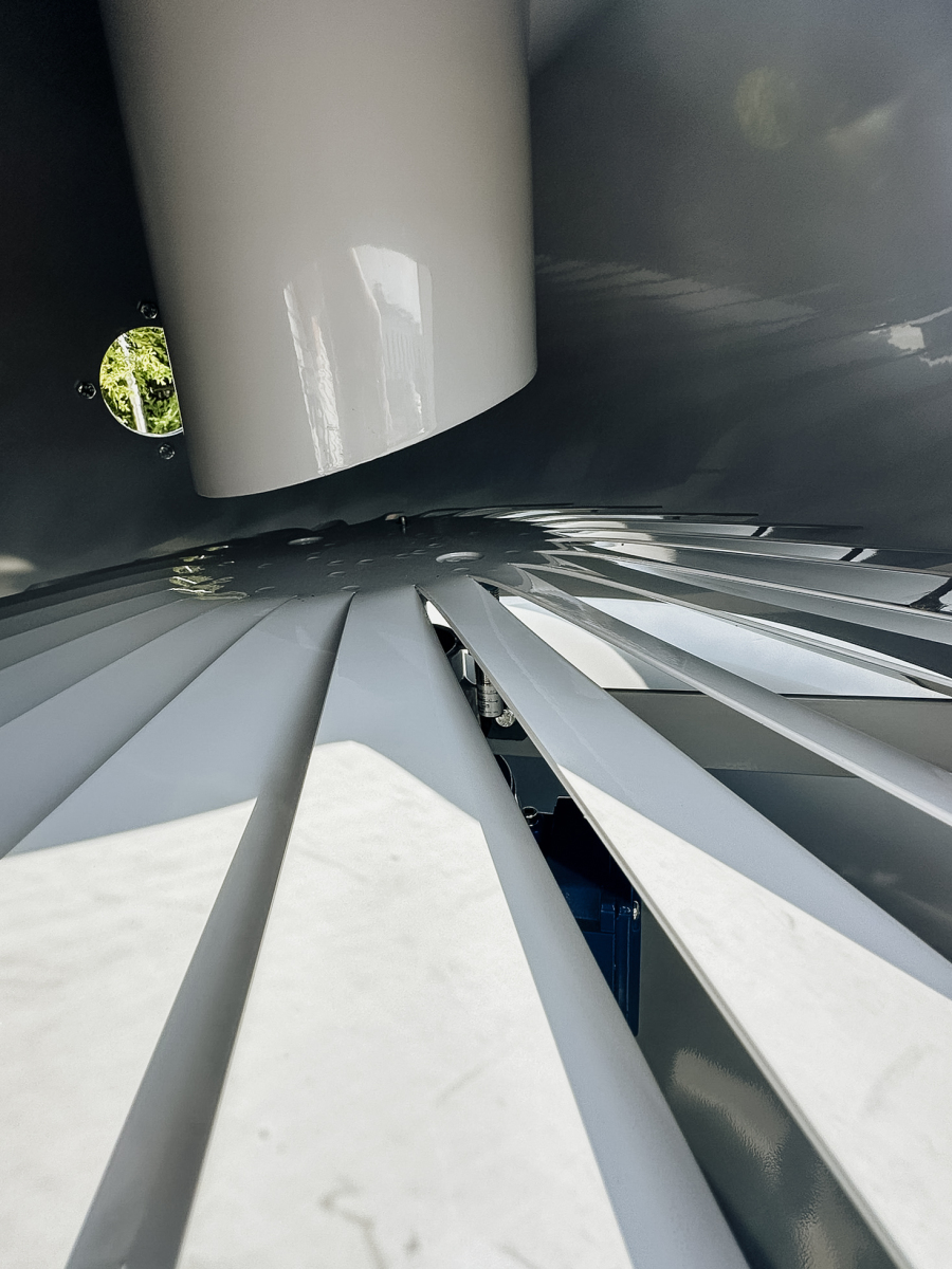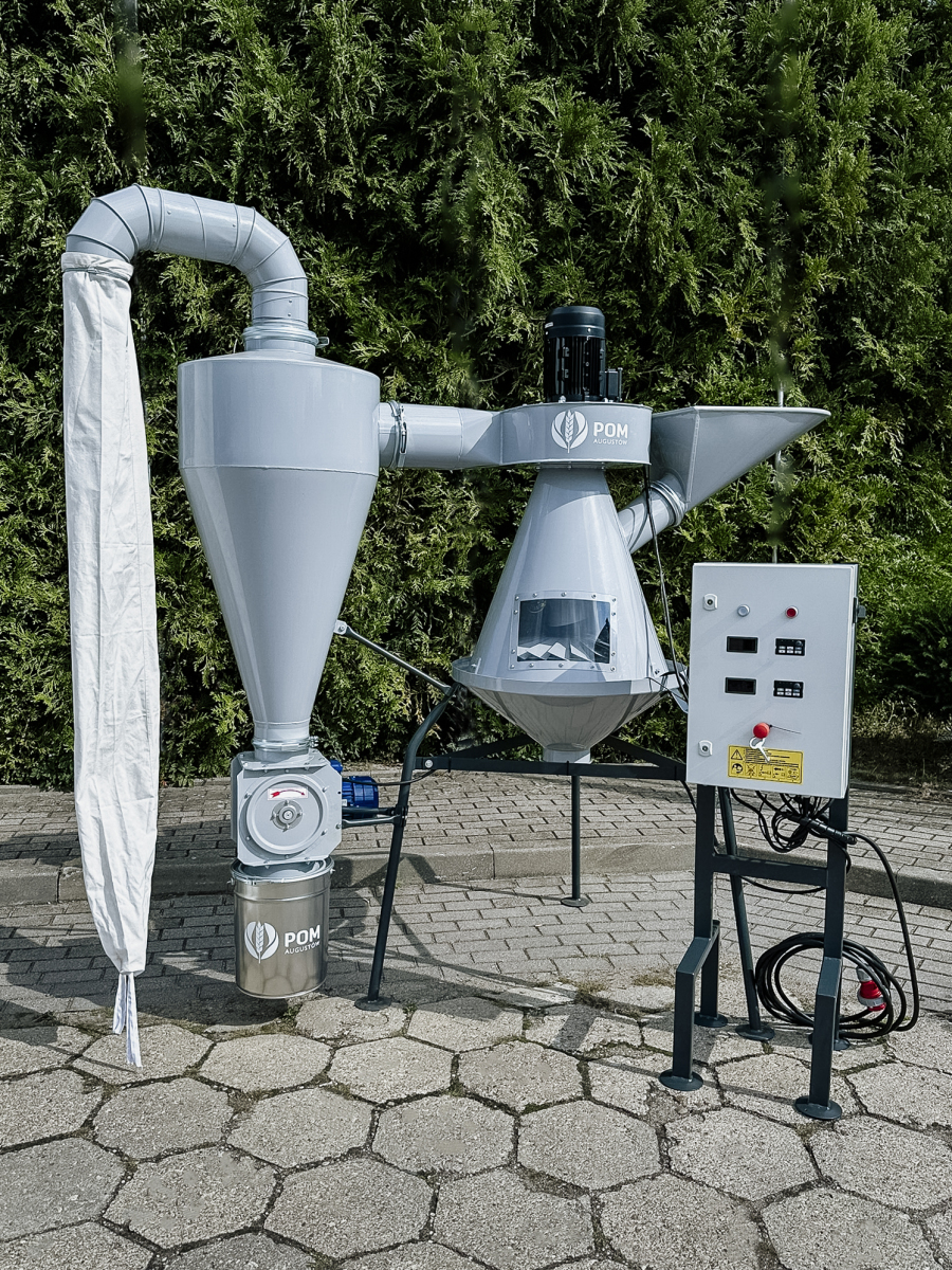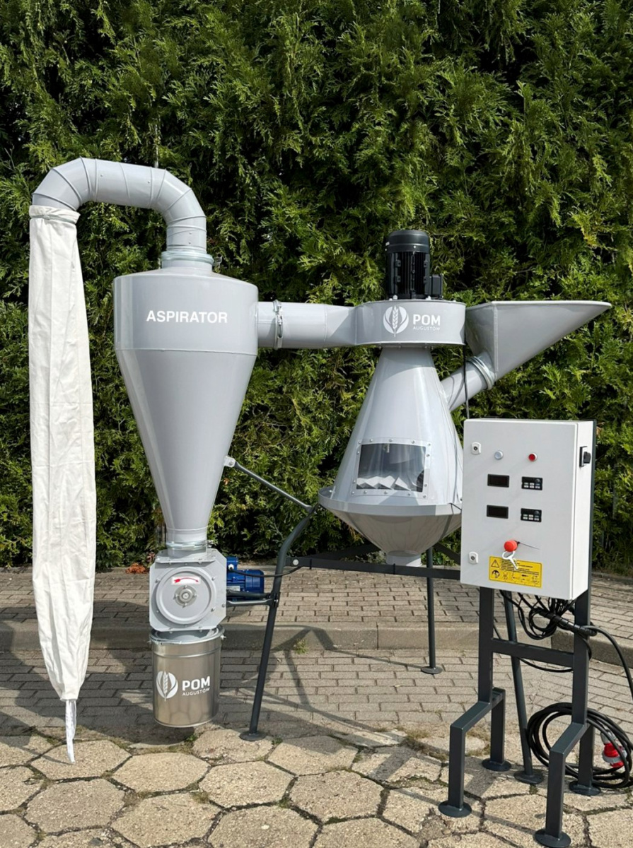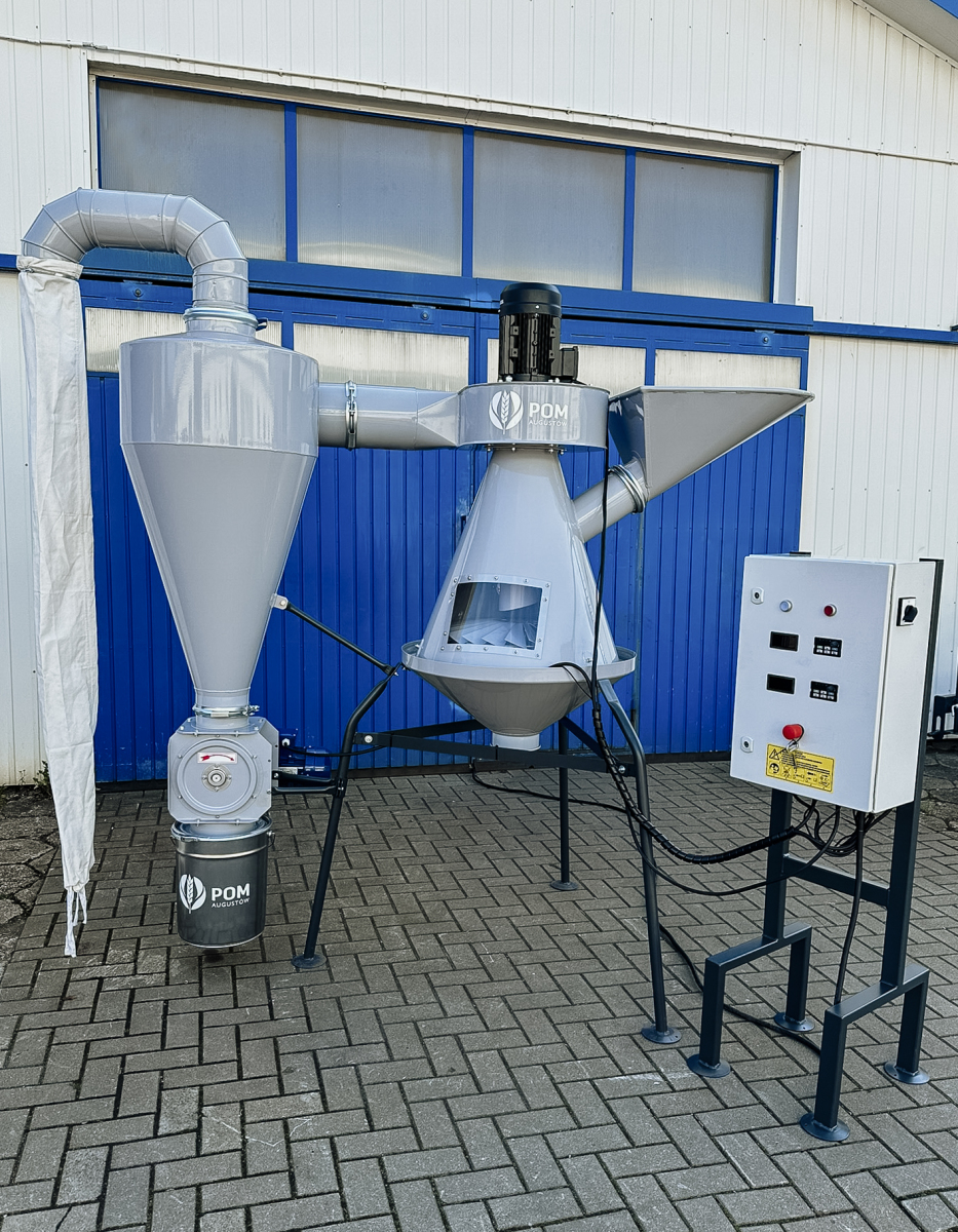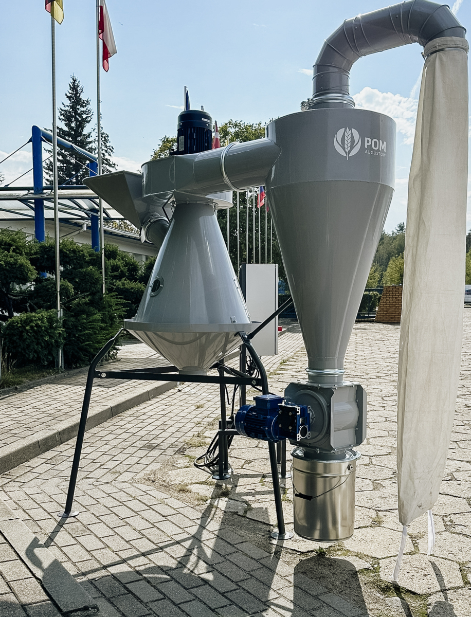 Separator Aspirator przeznaczony jest do oddzielania lekkich zanieczyszczeń np. pyłu, granulatów z tworzywa sztucznego itp. Załadunek aspiratora odbywa się za pomocą kosza zasypowego. Lekkie zanieczyszczenia są usuwane i trafiają do do cyklonu pyłowego. Oczyszczony materiał odprowadzany jest przez dolny otwór stożka.